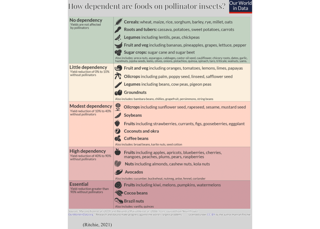 For centuries, humans have been interacting with bees with documentation from religious scriptures, mythology, iconography, and even in the stars of cosmology. In Greece, bees are considered an emblem for immortality (Hung, 2018). In 19th century eastern America, Telling the Bees was a tradition amongst beekeepers who would verbally inform their bees of any major event, possibly as an omen of good luck (Hung, 2018). In agriculture, the Western honeybee ranks as the most frequent pollinators for crops globally, helping other animal pollinators pollinate around 88% of all flowering plants (Hung, 2018). Of the 55 bee species managed by humans, a mere 12 species are specialized for crop pollination. Moreover, bees visit more than 90% of the world’s top 100 crops. (Patel, 2021). American crops such apples, cranberries, melons, almonds, broccoli, cherries, and blueberries all had yield reductions up to 90% without animal pollinators such as the Western honeybee (Ritchie, 2021).